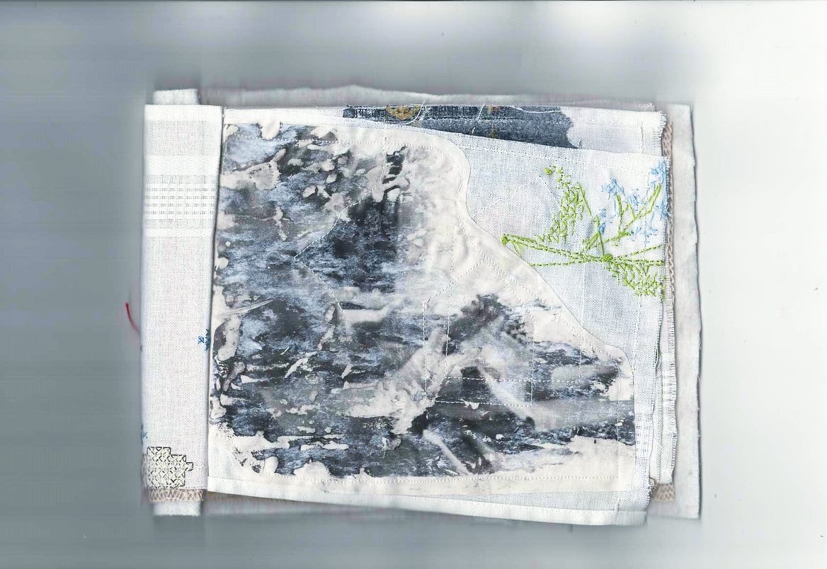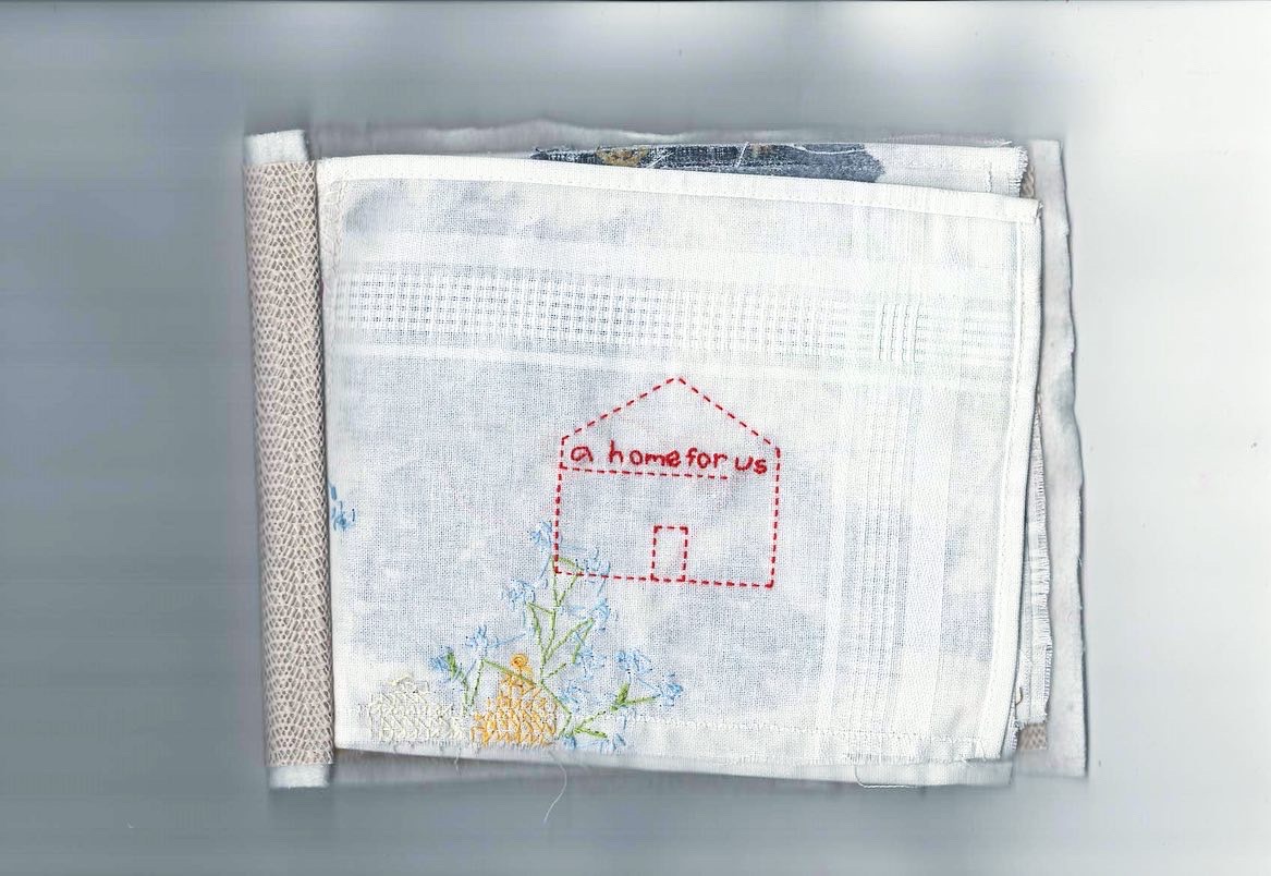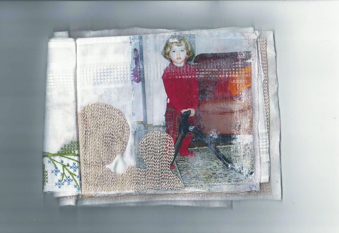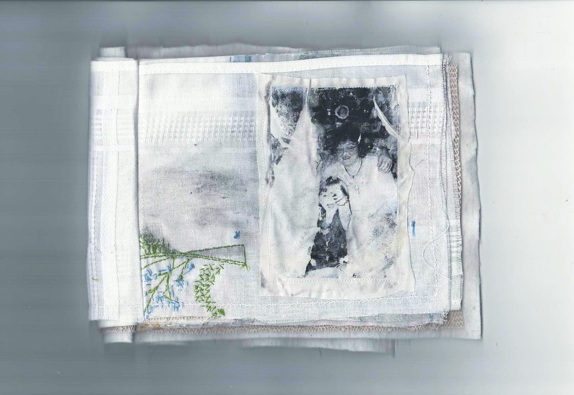 found fabrics, photo transfer, hand embroidery